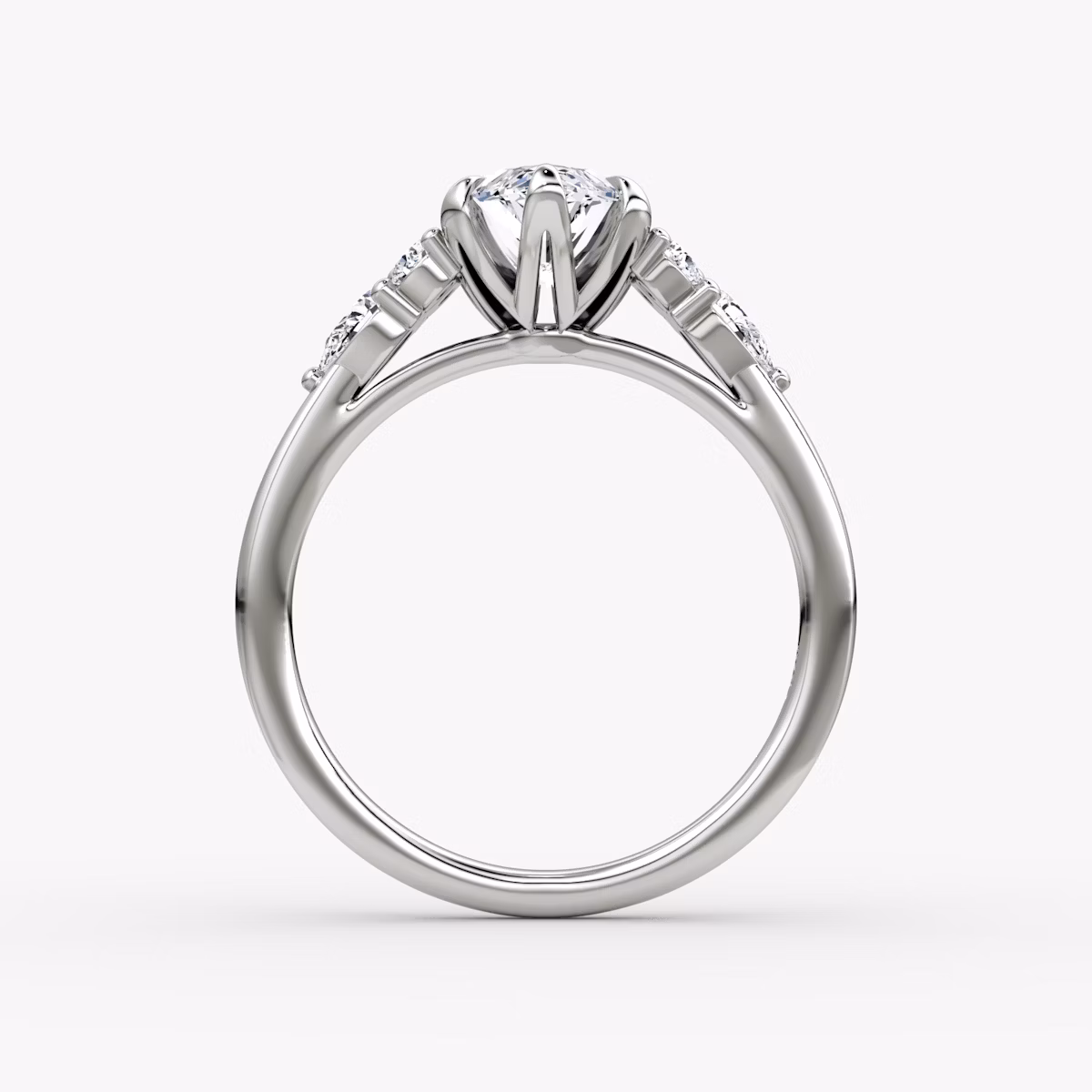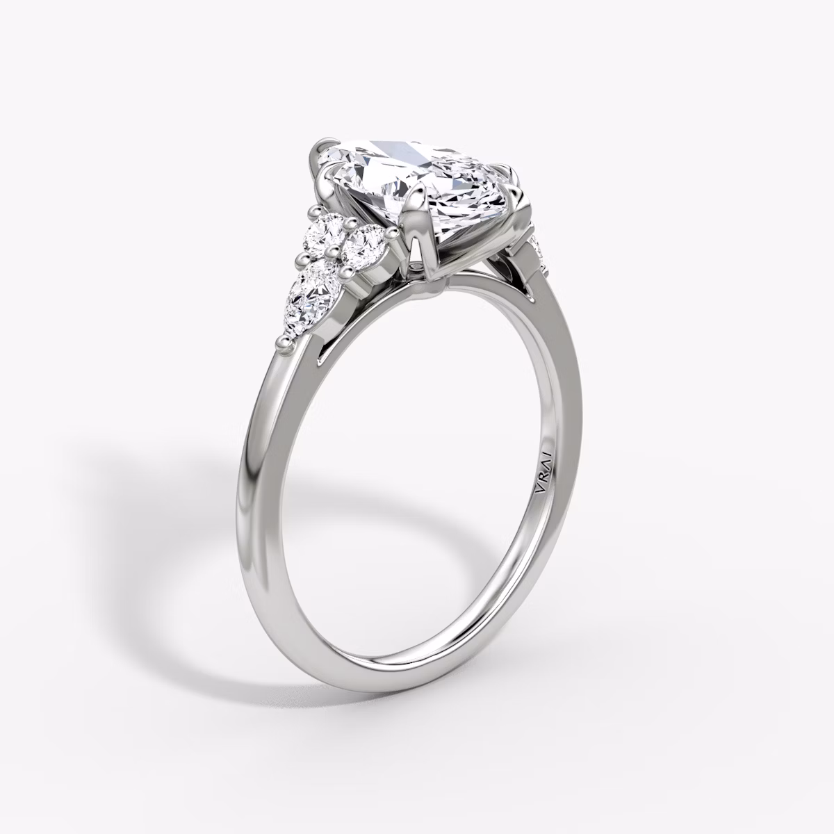 A cluster of Pear and Round Brilliant side stones enhance your VRAI created diamond of choice from either side in this vintage-inspired design. This scintillating take on a Cathedral setting features graceful arches that lift your center stone to catch the light, while v-shaped prongs secure it into place.