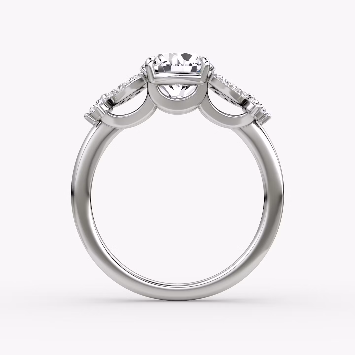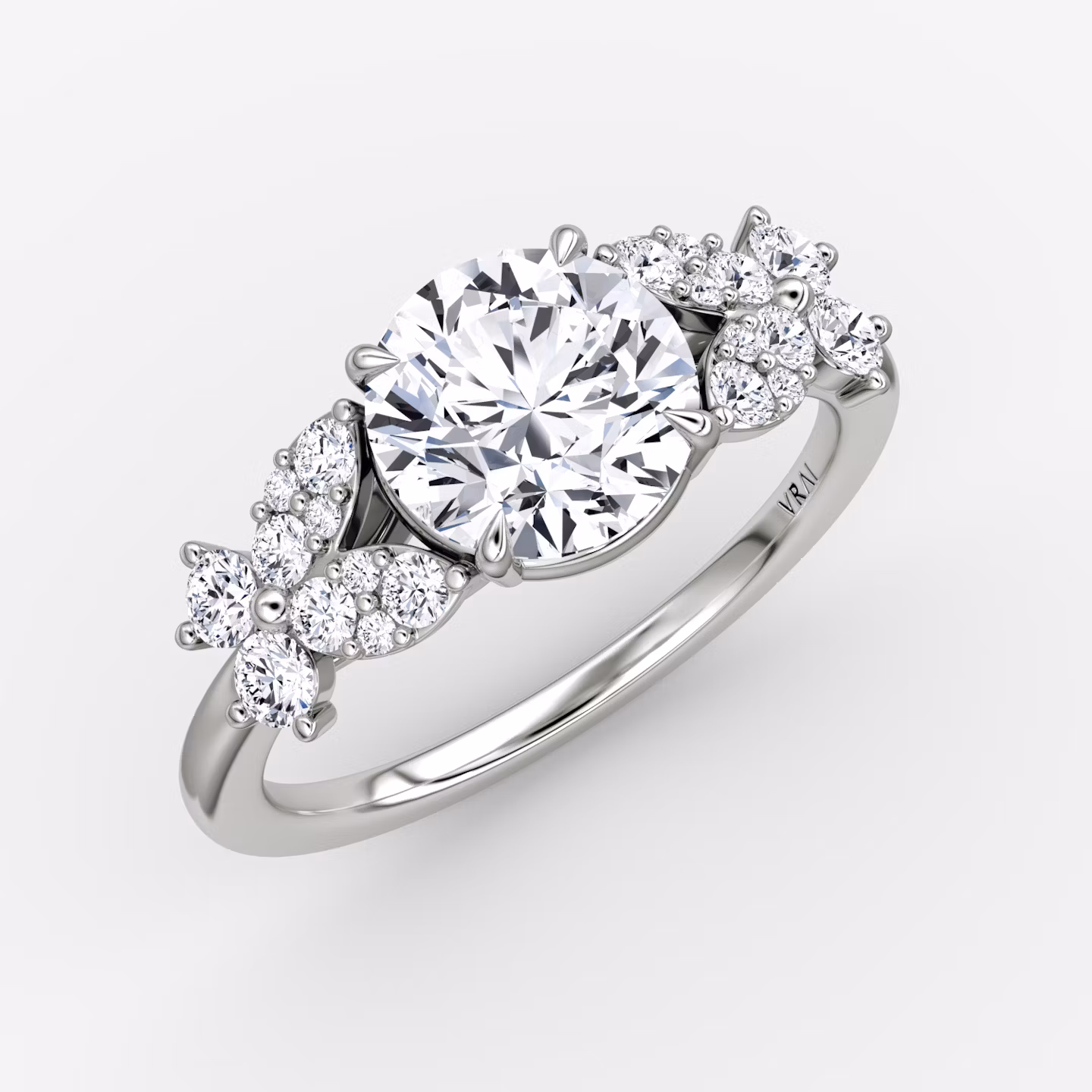 A nature-inspired take on our most sought-after setting. The signature sling dips slightly below the band, securing your VRAI created diamond in place while drawing in the light. Round side stones form petals on either side for a thoroughly floral look.