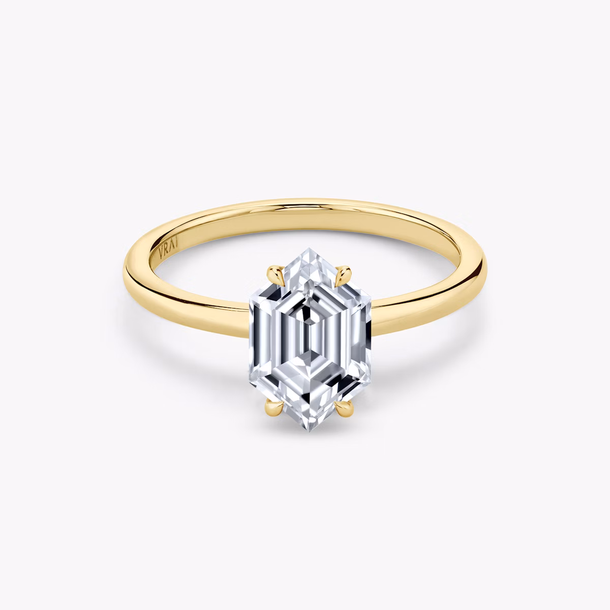 The Signature solitaire ring in 18k yellow gold with a long hexagon diamond